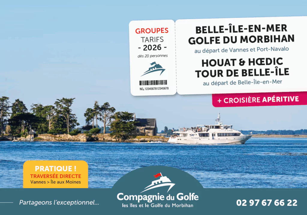 Nous sommes à votre écoute par téléphone 02 97 67 66 22 ou par mail contact@compagnie-du-golfe.fr pour vos projets d’excursion. Nous serons ravis de vous aider à organiser votre séjour dans le Golfe du Morbihan ☆